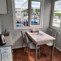 Осадка у понтонного катамарана настолько мала, что позволяет подойти практически к любому берегу. Швартоваться у причала или пристани – это самый простой вариант. При швартовке у плавучего причала или высокого пирса требуется установить трап. Однако, так как на плавдоме можно совершать водные прогулки, иногда швартовка может произойти в удалении от берега, особенно, если берег пологий и заболоченный. В таком случае выручает лодка, которую можно брать с собой.
