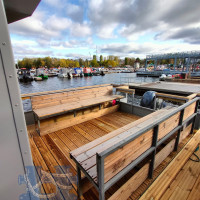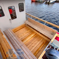 Безопасность пассажиров и персонала обеспечивается перильным ограждением из профильной трубы с гальваническим покрытием заводского исполнения, установленным по периметру катера.