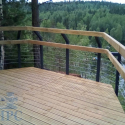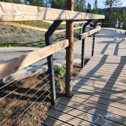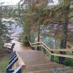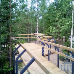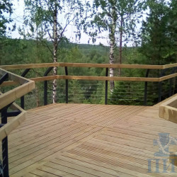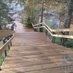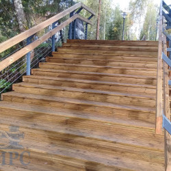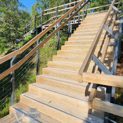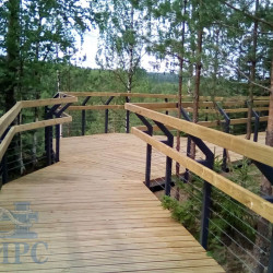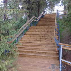 Лестницы и смотровые площадки в основе своей имеют прочный стальной каркас из оцинкованной трубы, который покрыт настилом из импрегнированной доски хвойных пород. На настиле выполнена специальная нарезка от скольжения. Лестницы и площадки имеют обязательное перильное ограждение.