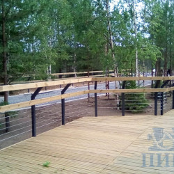 На дорожках может быть установлено перильное ограждение. Ограждение состоит из стоек с креплением к полу, и деревянных поручней прямоугольного сечения. Стойки изготовлены из стальной профильной трубы 70х70мм с фланцами крепления поручней и крепления к полу. Высота стойки 1260 мм. Поручни изготавливаются из импрегнированной доски хвойных пород, профиль поручня 45х90 и 45х100 мм. Стойки ограждения крепятся к полу (возможно дополнительное крепление к стене). Стойки крепятся к полу анкерами с учетом структуры пола. В стойках предусмотрены отверстия для продевания тросов уловителей d-5 из нержавеющей стали в количестве 7 шт..