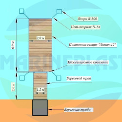 Трап имеет габариты 3,0 х 1,2 м и также как и понтон состоит из стальной рамы, обработанной антикоррозийным покрытием в заводских условиях, и импрегнированного соснового настила с нарезкой противоскольжения.