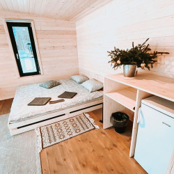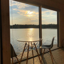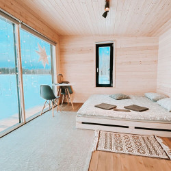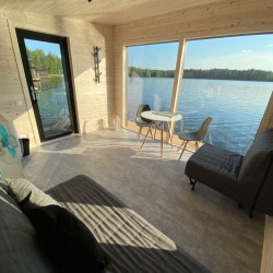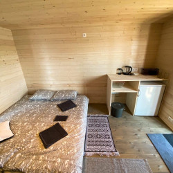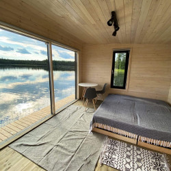 4 домика предлагают двухместное размещение, один – трехместное. В плавучем доме: двухспальная кровать, стол и стулья, кухонный уголок с чайником и холодильником, на террасе – уличная мебель, фонарики, на берегу – мангал, рукомойник. В большом домике дополнительно установлено раскладное кресло-кровать.