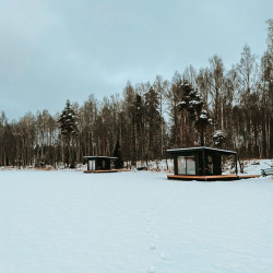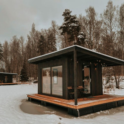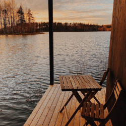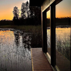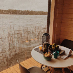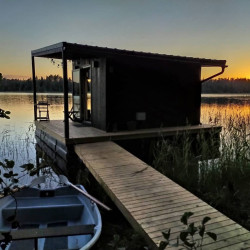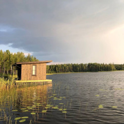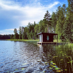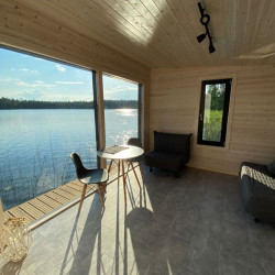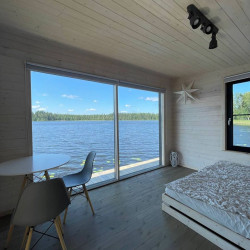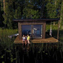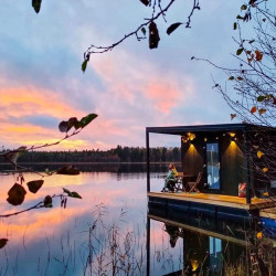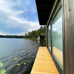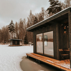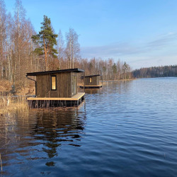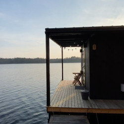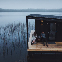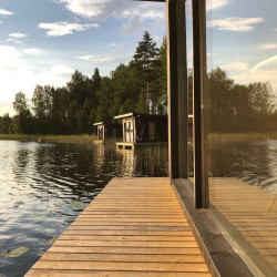Эти домики на воде уникального плавучего кемпинга расположены на акватории живописного карельского озера на удалении от жилых массивов.