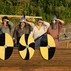 По бортам судна располагались щиты. Если драккар заплывал в дружественные земли, голова дракона убиралась, чтобы не напугать добрых духов, а вождь с носа корабля показывал белый щит.
