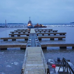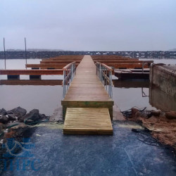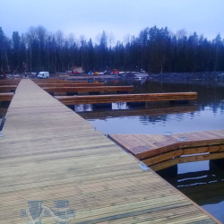 Для загородного клуба в Республике Карелия на Онежском озере были проведены работы по оборудованию яхтенного порта для стоянки маломерных судов. В закрытой марине установлен причальный комплекс, оснащенный швартовыми пальцами (причалами-разделителями), сервисными колонками и пожарным гидрантом. Для закрепления судов на причалах и разделителях установлены стальные кнехты. На берегу установлена береговая тумба. С берегом причальный комплекс соединен консольным трапом с перильными ограждением.