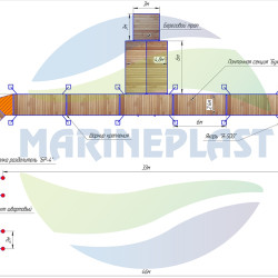 Настил понтонов выполнен из импрегнированной сосновой доски, на которой сделана нарезка от скольжения. Палубная доска связана в легкосъемные щиты, для обеспечения доступа к поплавкам и якорной системе.