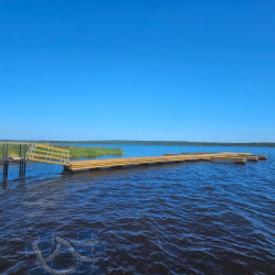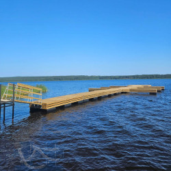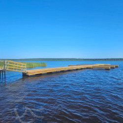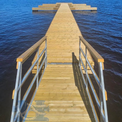 • Палубный настил выполнен из импрегнированной террасной доски (сосна), на которой может быть сделана нарезка от скольжения. Палубная доска связана в легкосъемные щиты, для обеспечения доступа к якорной системе.