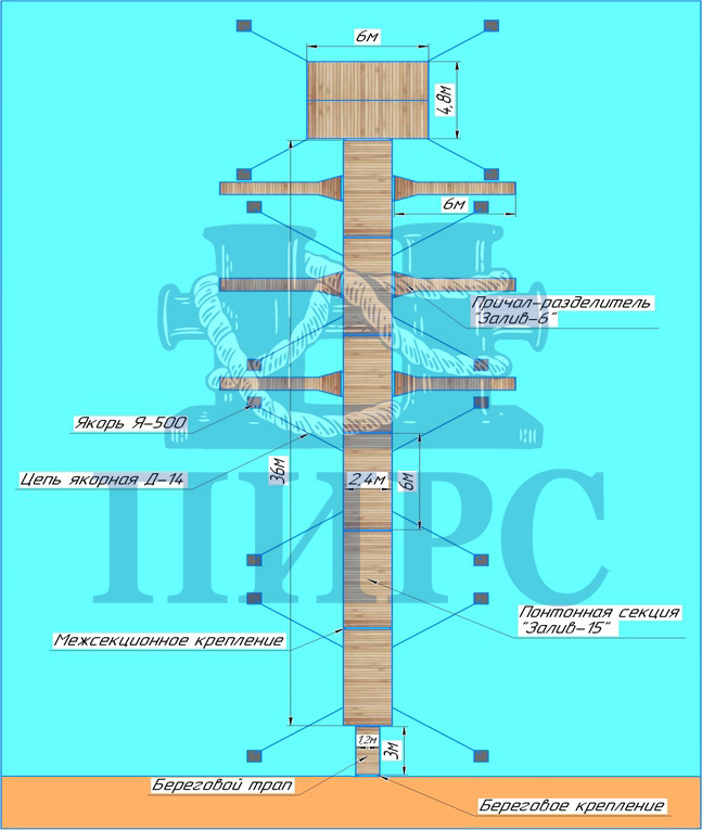 На акватории весь комплекс закреплен при помощи якорной системы из мертвых якорей и якорных цепей, расположенных диагонально.
