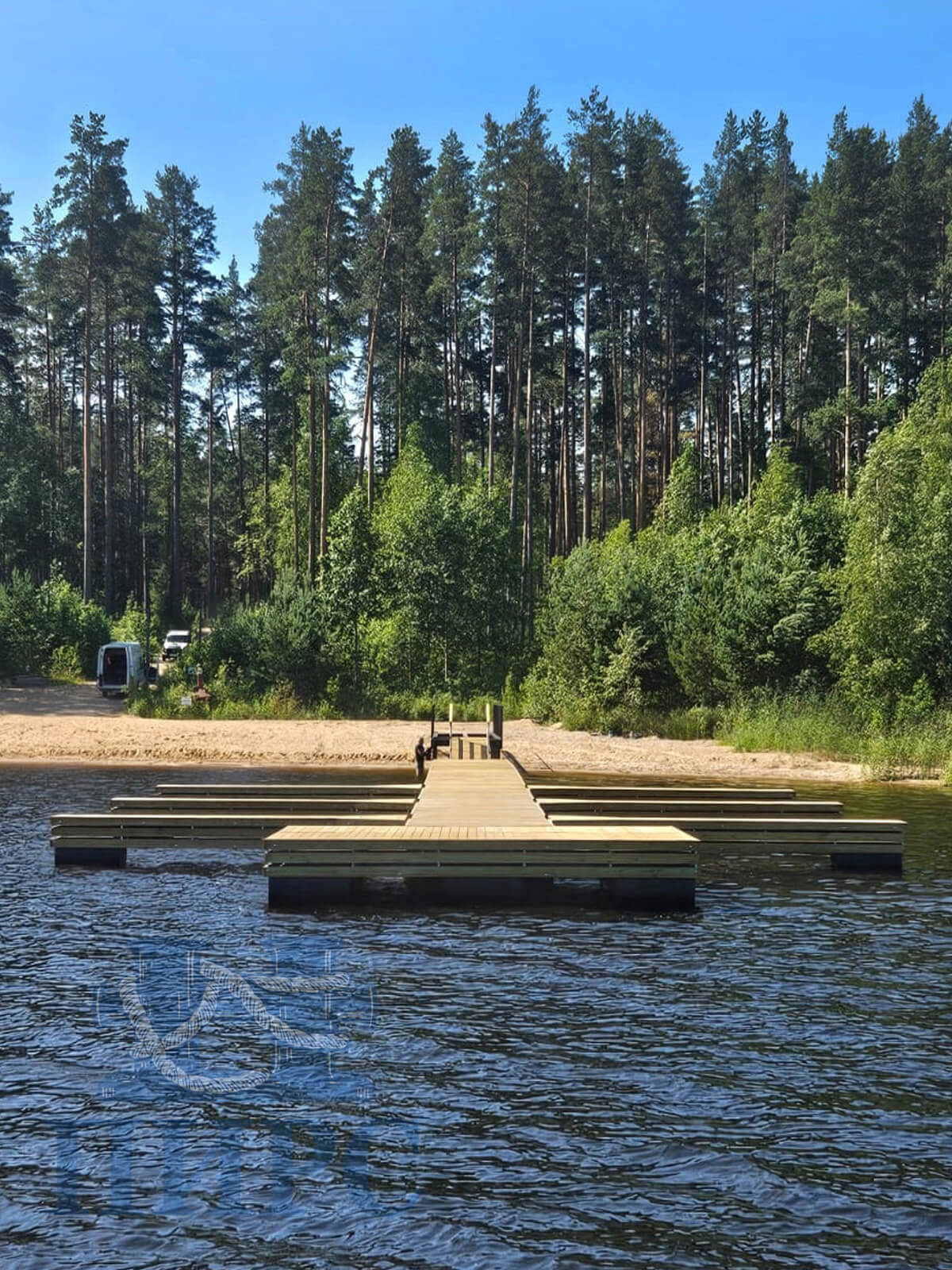 • Палубный настил выполнен из импрегнированной террасной доски (сосна), на которой может быть сделана нарезка от скольжения. Палубная доска связана в легкосъемные щиты, для обеспечения доступа к якорной системе.