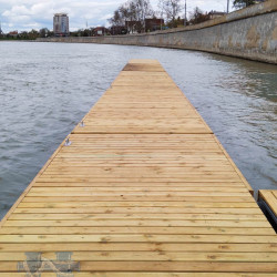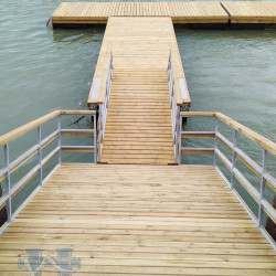 Палубный настил выполнен из импрегнированной террасной доски (сосна) толщиной 28 мм. и нарезкой от скольжения. Палубная доска связана в легкосъемные щиты, для обеспечения доступа к якорной системе.