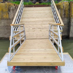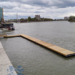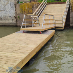 Особенностью акватории заказчика является резкое колебание уровня воды, связанное с работой расположенного рядом водохранилища. Поэтому конструкторами завода Маринпласт было предусмотрено устройство подвижного соединения причального комплекса с имеющейся бетонной стенкой, а для спуска на причал установлен трап на роликовых опорах. Это позволит осуществлять безопасное перемещение пассажиров и грузов при любой высоте уровня воды.