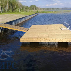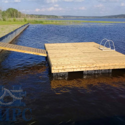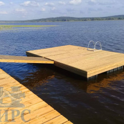 Площадка составлена из двух понтонов проекта Затон-12, имеет удобную лесенку для спуска в воду. К берегу понтон закреплен при помощи берегового трапа и межсекционного крепления. Общие размеры площадки: 4 Х 6 метров.