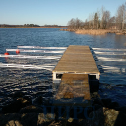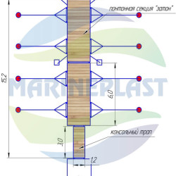Конструкция понтона представляет собой стальную раму, обработанную методом горячего цинкования в заводских условиях, которая поставлена на герметичные модули плавучести (полиэтиленовые поплавки), изготовленные методом ротоформовки. настил понтона выполнен из импрегнированной сосновой доски с нарезкой противоскольжения.