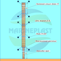 Причал составлен из понтонных секций «Затон-15» с габаритами 6,0х2,4 метра, установленных на модули плавучести Н-400. Данные секции имеют увеличенную ширину, что повышает их остойчивость. Также ширина секции делает комфортным размещение шезлонгов для отдыха и купальной зоны на конце причала.