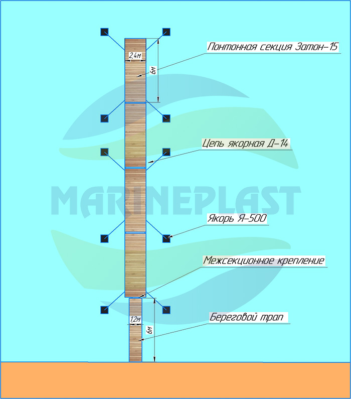 Причал составлен из понтонных секций «Затон-15» с габаритами 6,0х2,4 метра, установленных на модули плавучести Н-400. Данные секции имеют увеличенную ширину, что повышает их остойчивость. Также ширина секции делает комфортным размещение шезлонгов для отдыха и купальной зоны на конце причала.