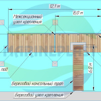 С берегом причал соединен береговым консольным трапом на роликовых опорах, который имеет габариты 6,0х1,2 м и перильное ограждение высотой 0,8 м.