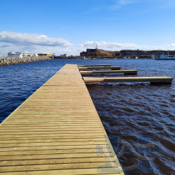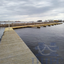 Установленная причальная линия составлена из понтонов модели «Затон-12» с габаритами 6,0х2,0 м, а также более высоких понтонов модели «Залив-30» с габаритами 12,0х2,4 м. Для обеспечения безопасного прохода по причалу между понтонными секциями размещены переходные трапы 2,4х1,0 м. К существующему пирсу новая линия закреплена при помощи усиленного межсекционного крепления, между собой понтоны соединены межсекционным креплением на тросовых стяжках с демпферами и цепным ограничителем. Для схода на существующий пирс установлен усиленный береговой трап с габаритами 2,0х1,0 м.