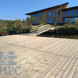 Конструкция понтонов для парка представляет собой стальную оцинкованную раму секционного исполнения, установленную на полиэтиленовые модули плавучести. Рама покрыта щитовым деревянным настилом из доски хвойных пород с нарезкой противоскольжения, пропитанной методом импрегнации. Также она имеет бортовую обшивку из той же доски.