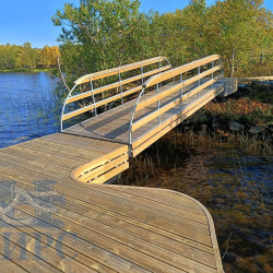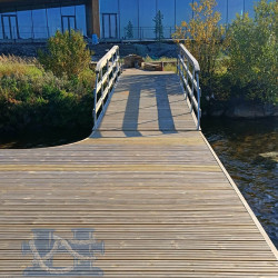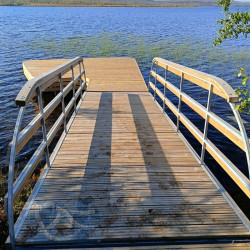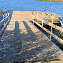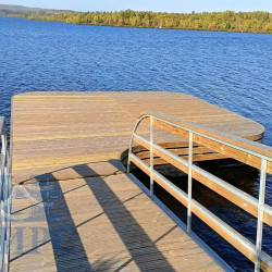 С берегом понтон соединен переходным трапом с перильным ограждением. На берегу весь комплекс закреплен береговой тумбой на основе стальной рамы, обшитой импрегнированной доской хвойных пород.