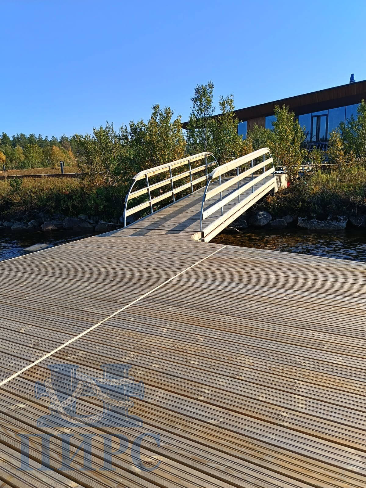 С берегом понтон соединен переходным трапом с перильным ограждением. На берегу весь комплекс закреплен береговой тумбой на основе стальной рамы, обшитой импрегнированной доской хвойных пород.