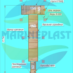 - Палубный настил выполнен из импрегнированной террасной доски (сосна), на которой может быть сделана нарезка от скольжения. Палубная доска связана в легкосъемные щиты, для обеспечения доступа к якорной системе.