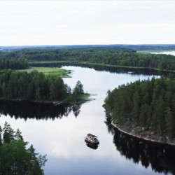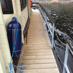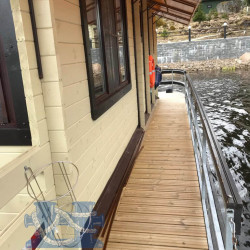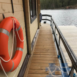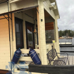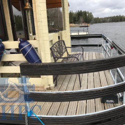 Для загородного клуба в Ленинградской области спроектирован и построен самоходный плавучий дом на понтоне с сауной.